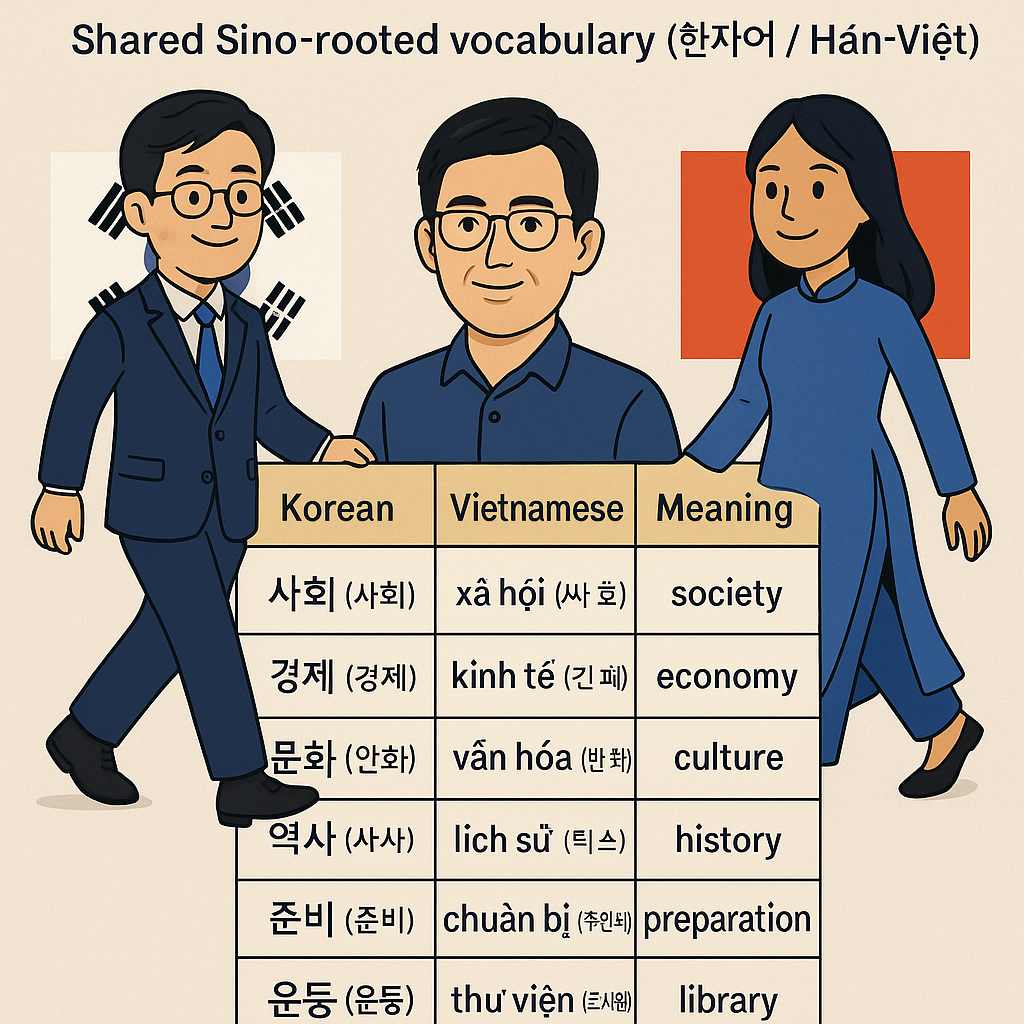 베트남어와 한국어 발음 유사성의 가장 근본적이고 지배적인 이유는 바로 **한자(漢字)**입니다. 역사적으로 한국과 베트남은 모두 중국의 강력한 문화적 영향력 아래 있었습니다. 이 과정에서 양국은 중국의 문자 체계인 한자를 받아들여 지식과 문화를 기록하고 소통하는 데 사용했습니다.