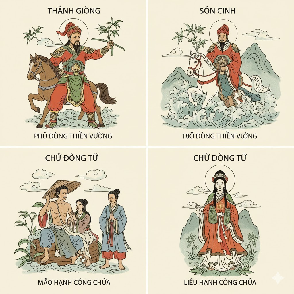 - 손띤(Sơn Tinh): 탄비엔 산(Ba Vì 산맥)의 신으로, 산과 숲을 다스리는 능력을 가졌습니다.
